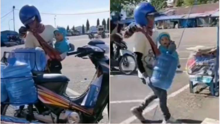 Sebuah video viral memperlihatkan kegigihan seorang bapak pengantar galon yang bekerja sambil menggendong anaknya.